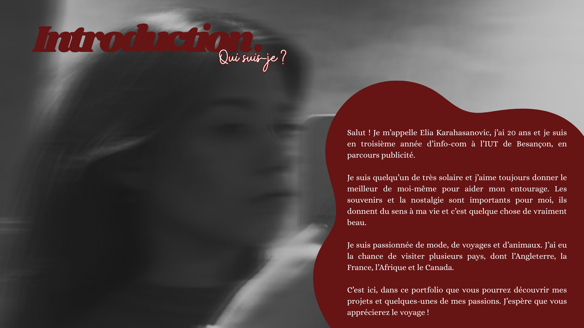 Je m’appelle Elia Karahasanovic, j’ai 20 ans et je suis actuellement étudiante en troisième année d’information-communication en parcours publicité à l’IUT de Besançon.